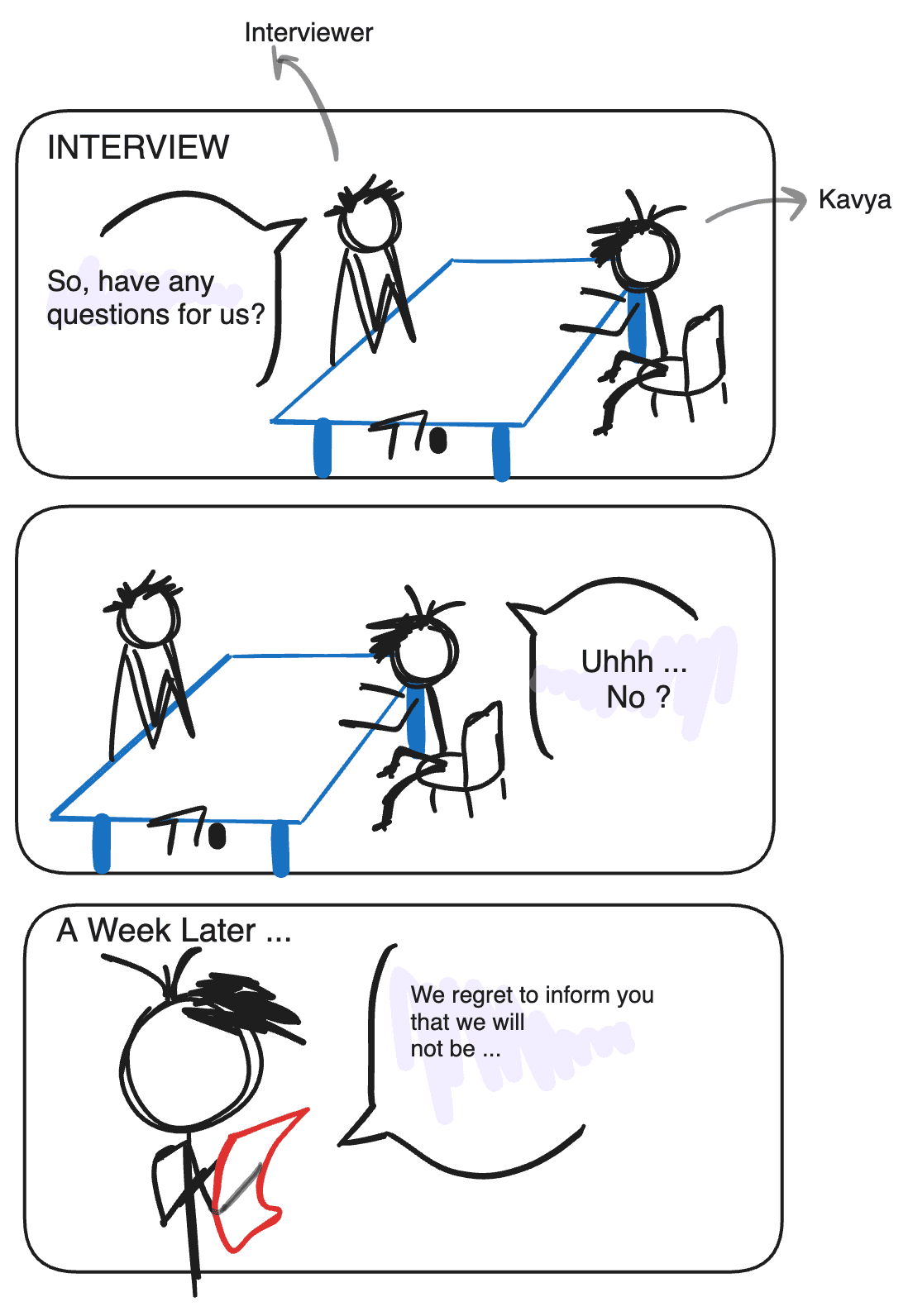 The last three questions are literally a litmus test for the interviewer's confidence in you. That aside, these are the questions that will ground you back to reality. Especially after you've brought yourself to an elevated state of confidence to counter the nervousness of giving one of these interviews.